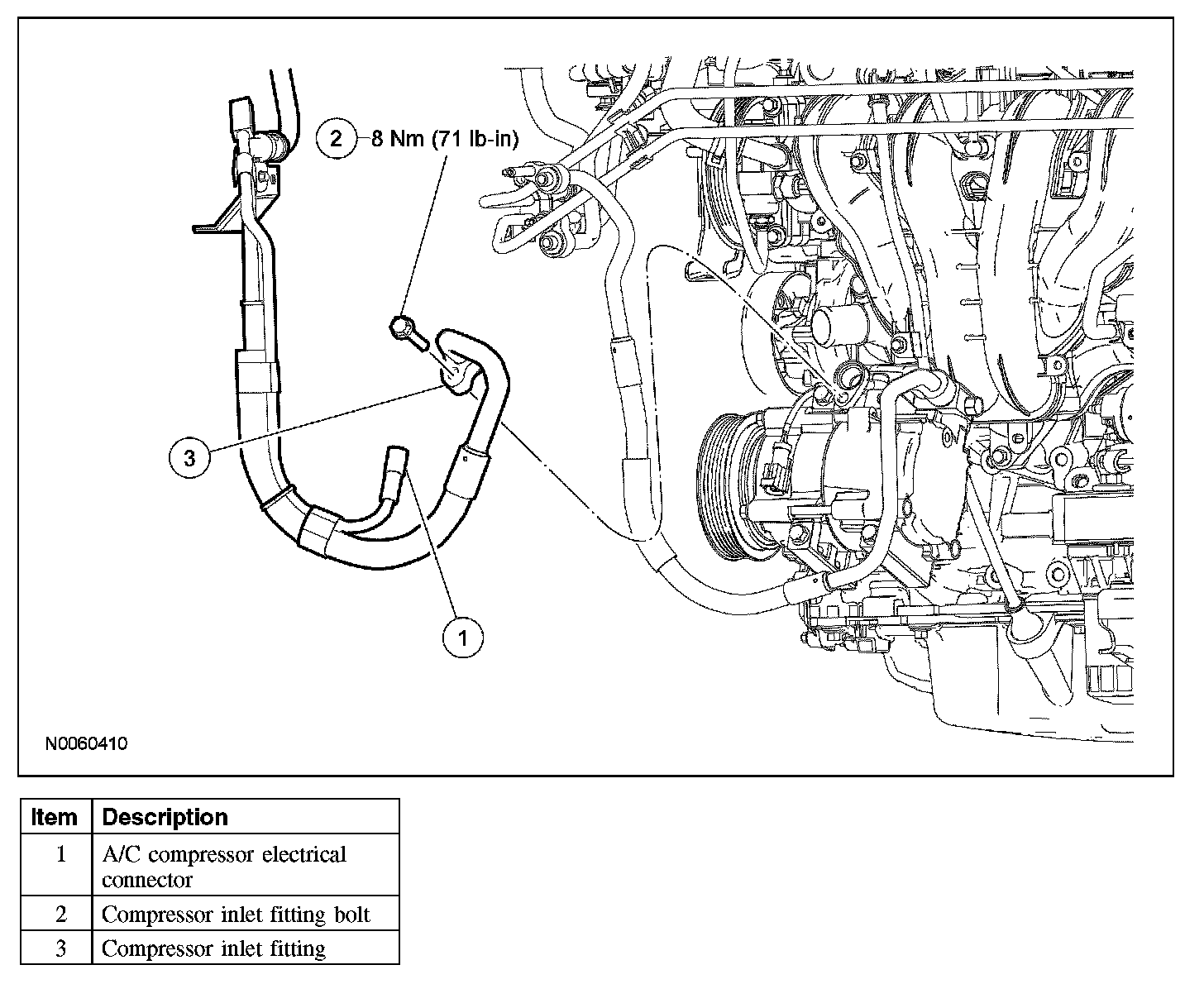 6. Remove the compressor inlet fitting bolt and disconnect the fitting.