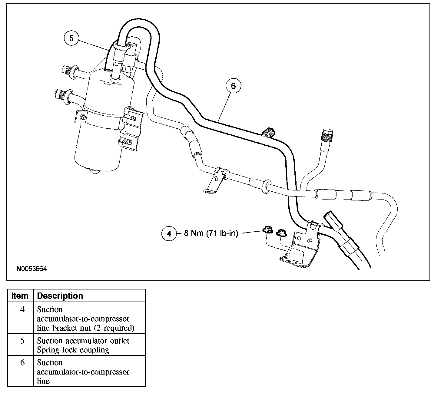NOTE: Installation of a new suction accumulator is not required when repairing the air conditioning system, except when there is physical evidence of contamination from a failed A/C compressor or damage to the suction accumulator.