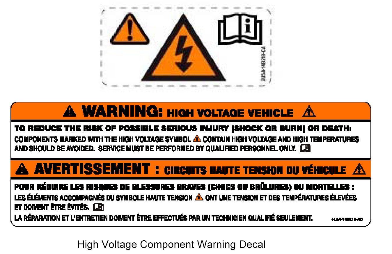 - Warning decals like the ones shown here - will be located on components included in the high voltage system.