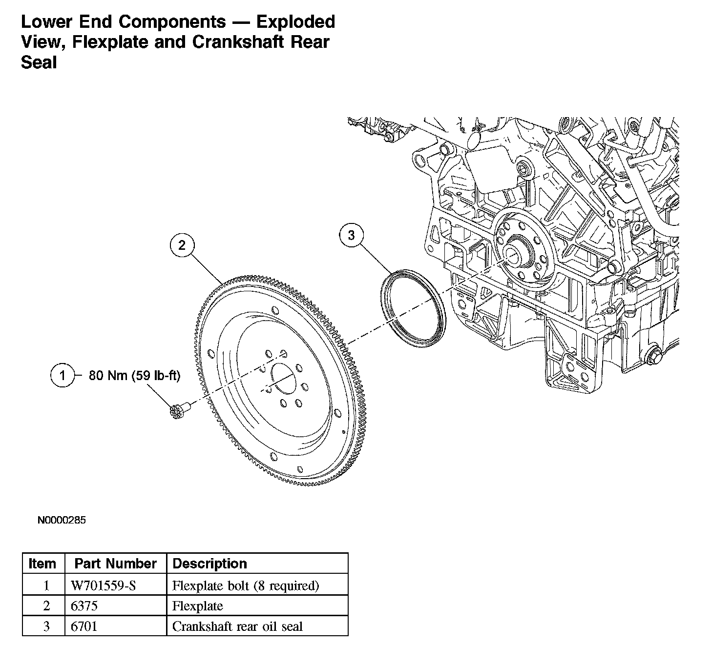 Lower End Components - Exploded View, Flexplate and Crankshaft Rear Seal: