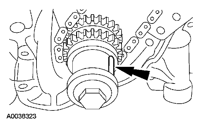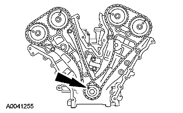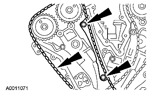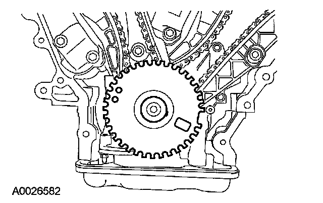 ^ Align the marks on the timing chain with the marks on the camshaft and crankshaft sprockets.