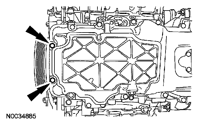 15. Remove the 2 oil pan-to-front cover bolts.