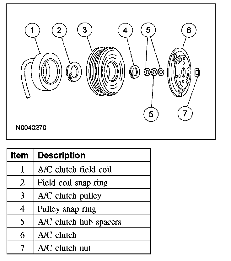 A/C COMPRESSOR AND CLUTCH ASSEMBLYNOTE: Internal A/C compressor components are not serviced separately. The variable scroll compressor is serviced only as an assembly. The A/C clutch, A/C clutch pulley and the A/C clutch field coil are serviceable.
