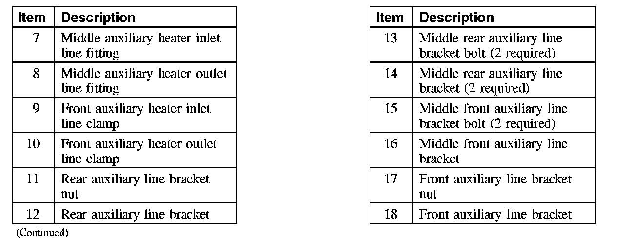 - The auxiliary heater inlet and outlet lines are not supplied together as an assembly. The auxiliary heater inlet line and outlet line are each installed from the factory as one-piece assemblies. The replacement parts are supplied as separate kits containing 2-piece lines for ease of installation.