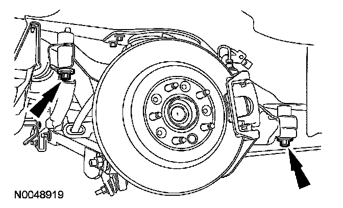 17. Remove the 2 LH rear brake caliper bolts and position the caliper aside.
