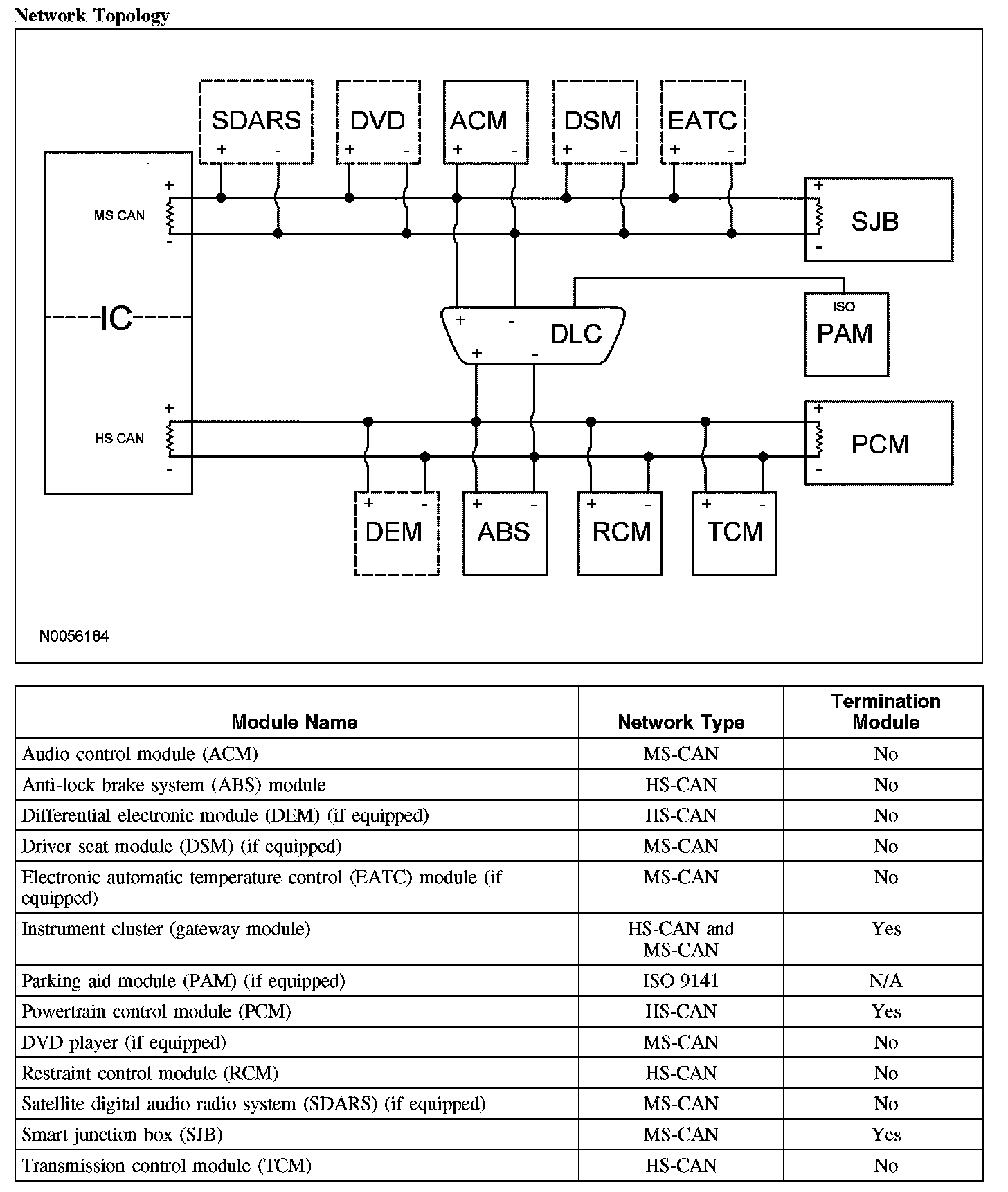 The instrument cluster is the gateway module, translating HS-CAN to MS-CAN and vice versa. This information allows a message to be distributed throughout both networks. The instrument cluster is the only module on this vehicle that has this ability.