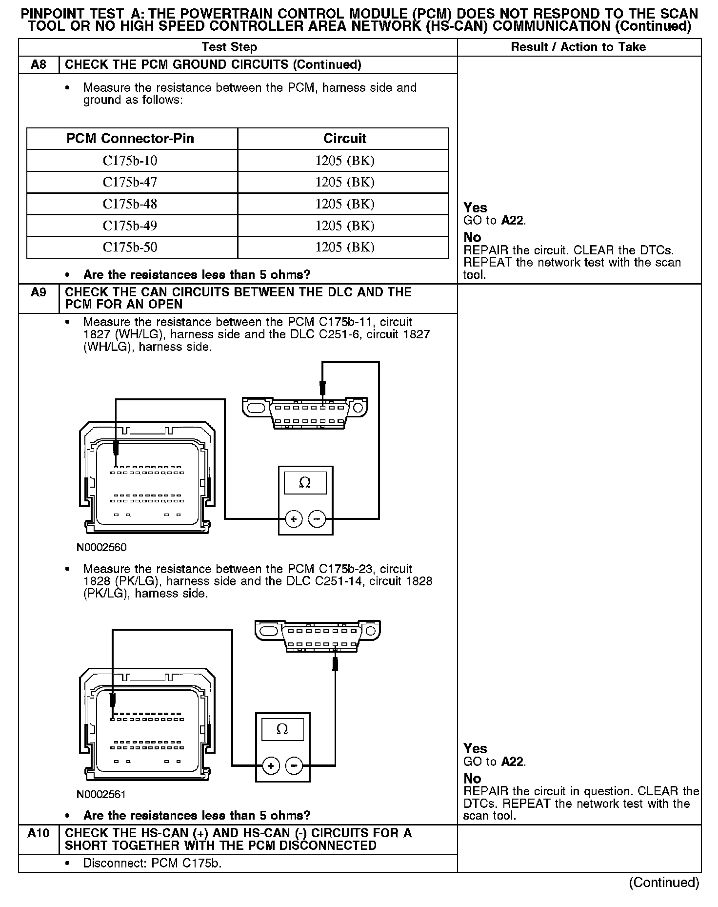 PINPOINT TEST A: THE POWERTRAIN CONTROL MODULE (PCM) DOES NOT RESPOND TO THE SCAN TOOL, OR NO HIGH SPEED CONTROLLER AREA NETWORK (HS-CAN) COMMUNICATIONA1-A2: