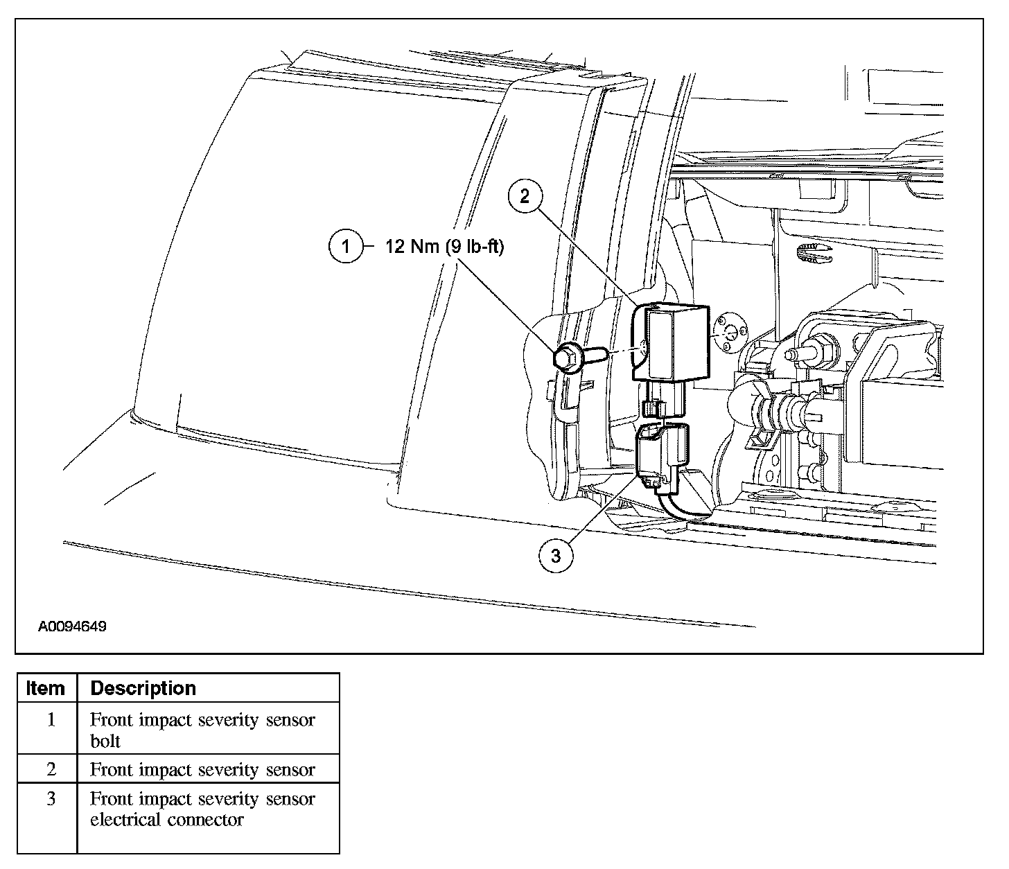 5. WARNING: The tightening torque of the air bag front impact severity sensor retaining nuts is critical for correct system operation.