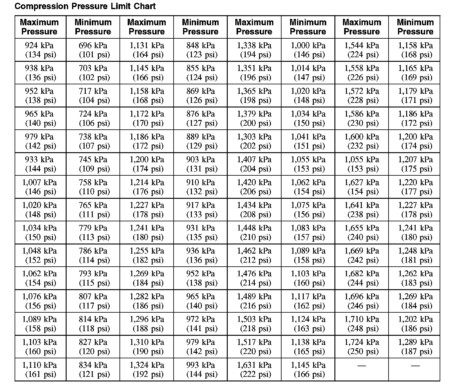 AllData Editors Note - Ford does not provide a cranking pressure specification, only an acceptable range.The indicated compression pressures are considered within specification if the lowest reading cylinder is at least 75 percent of the highest reading. For additional information, refer to the Compression Pressure Limit Chart.
