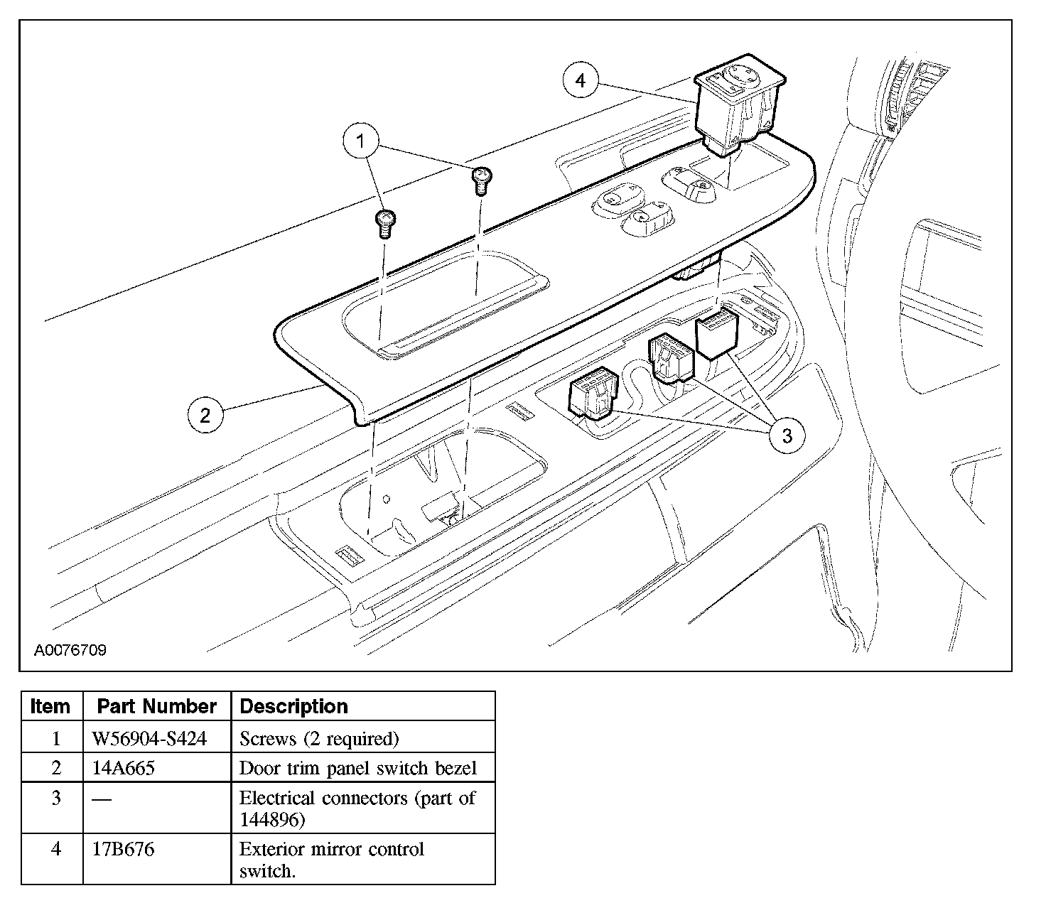 2. Lift the door trim panel switch bezel to expose the electrical connectors and disconnect the exterior rear view mirror electrical connector.