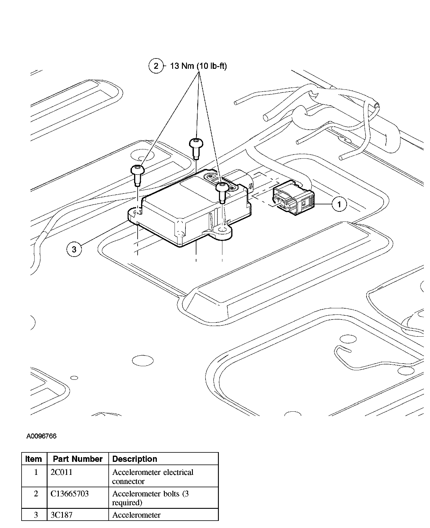 NOTE: When installing a new accelerometer, the anti-lock brake system (ABS) module must be configured (using vehicle as-built data) and calibrated. Follow the scan tool directions for the calibration procedures. For module configuration, refer to Information Bus (Module Configuration).