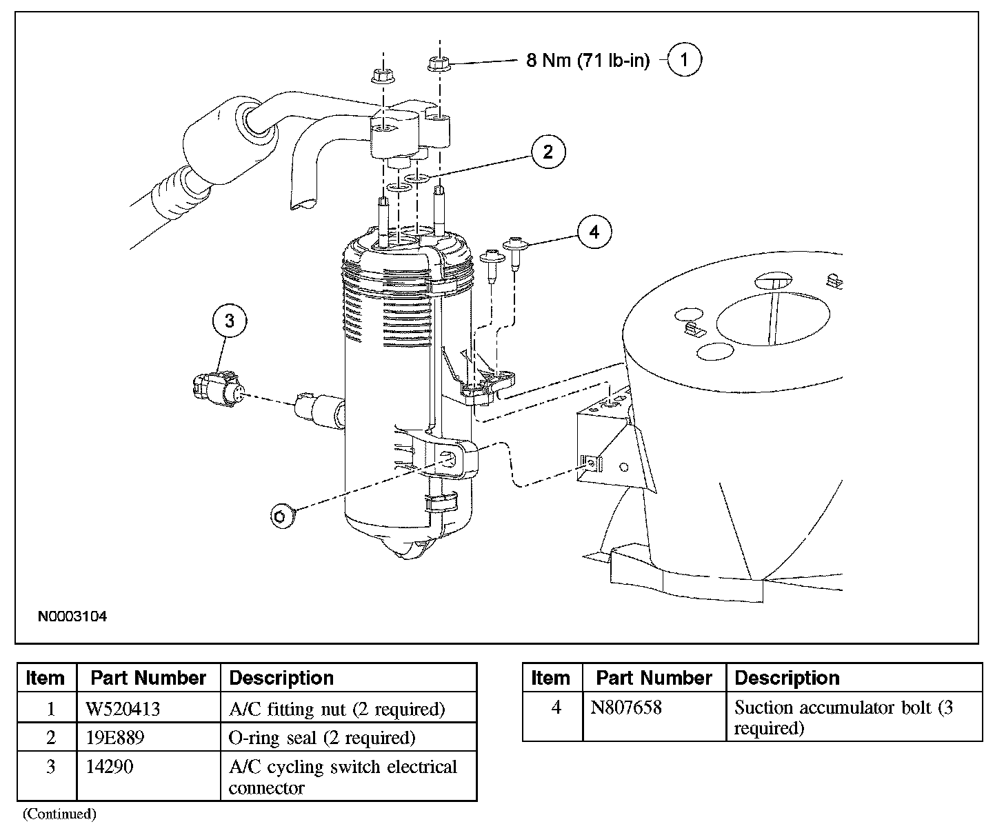 NOTE: Installation of a new suction accumulator is not required when repairing the air conditioning system, except when there is physical evidence of system contamination from a failed A/C compressor or damage to the suction accumulator.