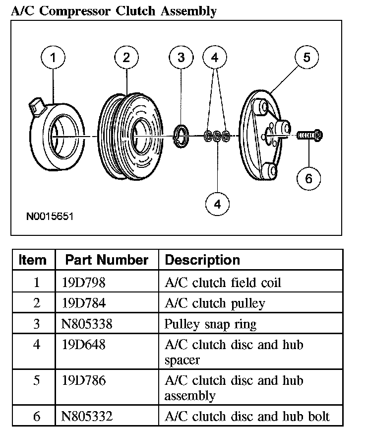 - When battery positive voltage (B+) is applied to the A/C clutch field coil, the clutch disc and hub assembly is drawn toward the A/C clutch pulley.
