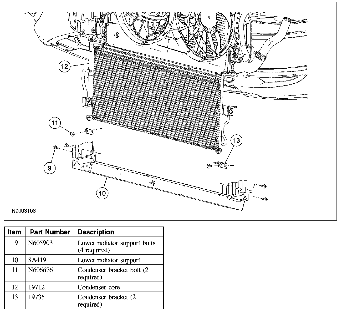 9. Correctly support the lower radiator support and remove the 4 lower radiator support bolts.