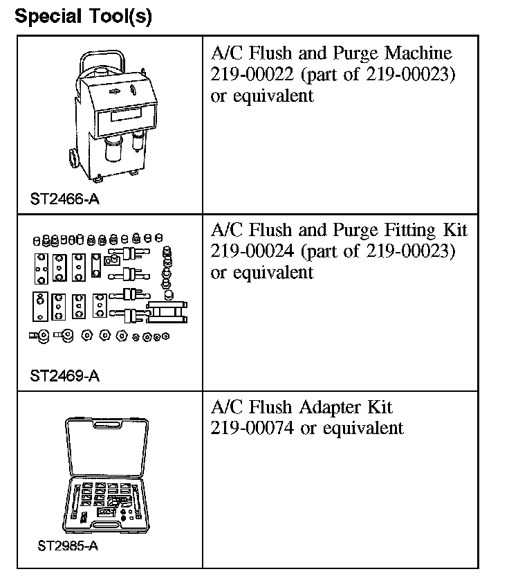 - Only the A/C Flush and Purge Machine kit 219-00023, which includes A/C Flush and Purge Machine 219-00022, A/C Flush and Purge Fitting Kit 219-00024 and A/C Systems Flushing Solvent, is approved for use on Ford vehicles. No other flushing device or solvent is approved for flushing heat exchangers (A/C condenser, A/C evaporator). Use of any other flusher or solvent may cause damage to the A/C system and the flushing unit.