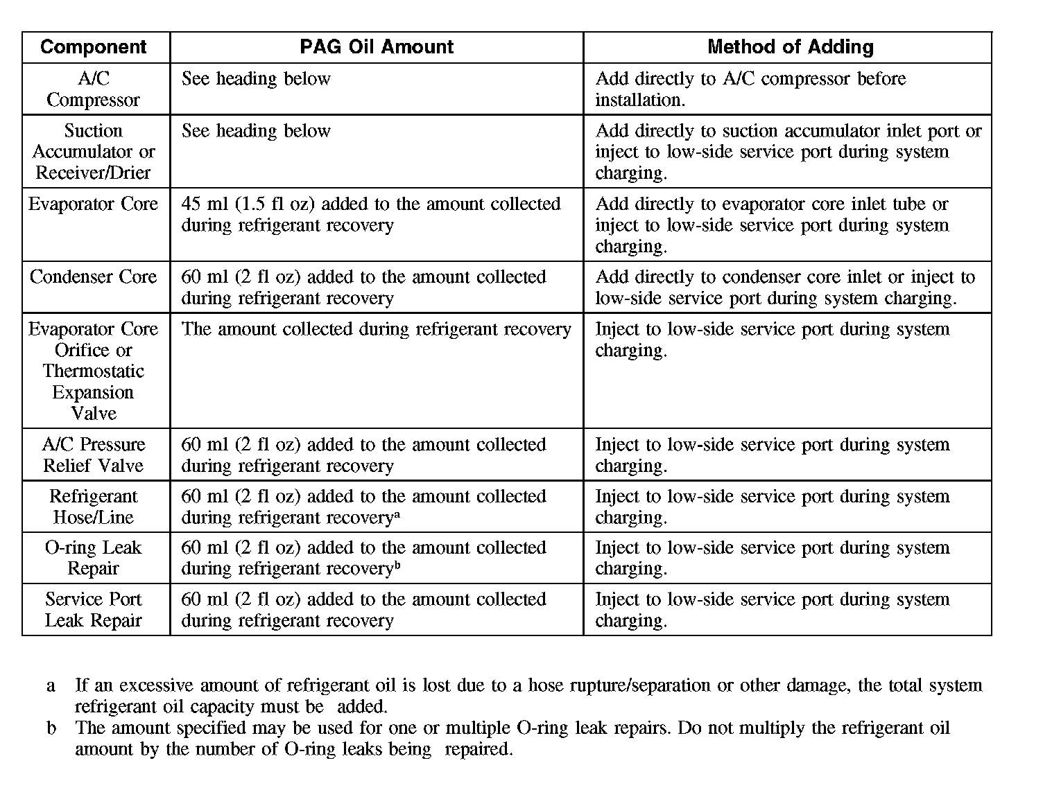 CAUTION: During normal A/C operation, oil is circulated through the system with the refrigerant, and a small amount is retained in each component. If certain components of the system are removed, some of the refrigerant oil will go with the component. To maintain the original total oil charge, it is necessary to compensate for the oil lost by adding oil to the system with the new part.