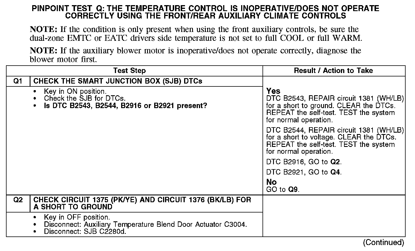 PINPOINT TEST Q: THE TEMPERATURE CONTROL IS INOPERATIVE/DOES NOT OPERATE CORRECTLY USING THE FRONT/REAR AUXILIARY CLIMATE CONTROLSQ1-Q2: