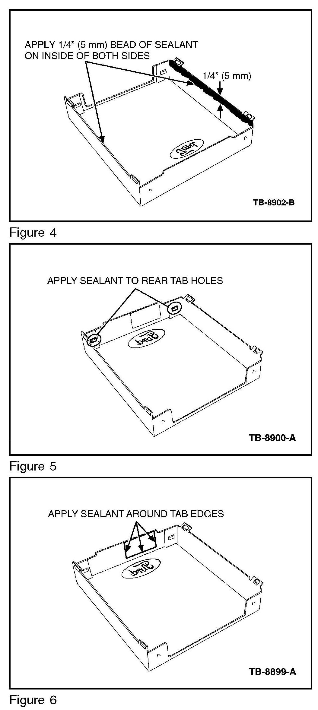 8. Apply Motorcraft(R) Ultra Silicone Sealant to all edges depicted. (Figure 4, 5, 6, 7) Proceed directly to Step 9 - do not let the sealant skin over.