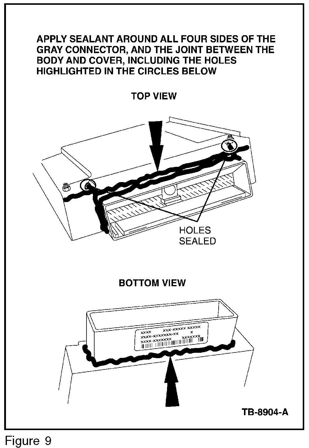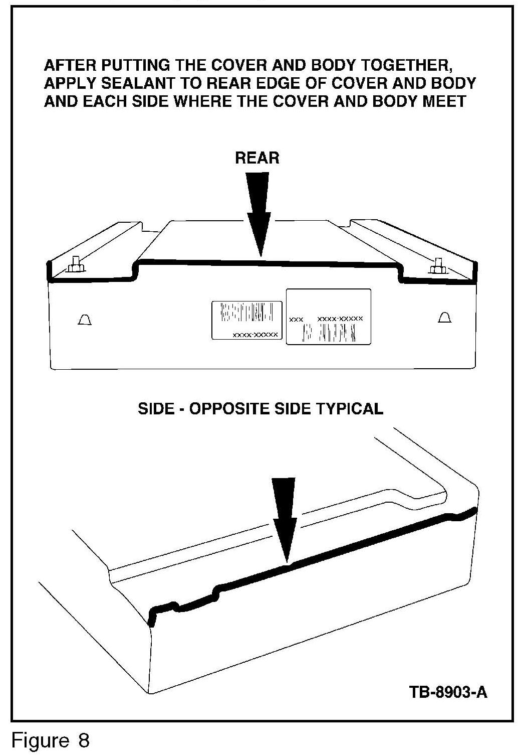 10. Reassemble the PCM, and bend the retaining clips back fully. Make sure a full seal is created around the top edge of the PCM - add sealant as required. (Figure 8)