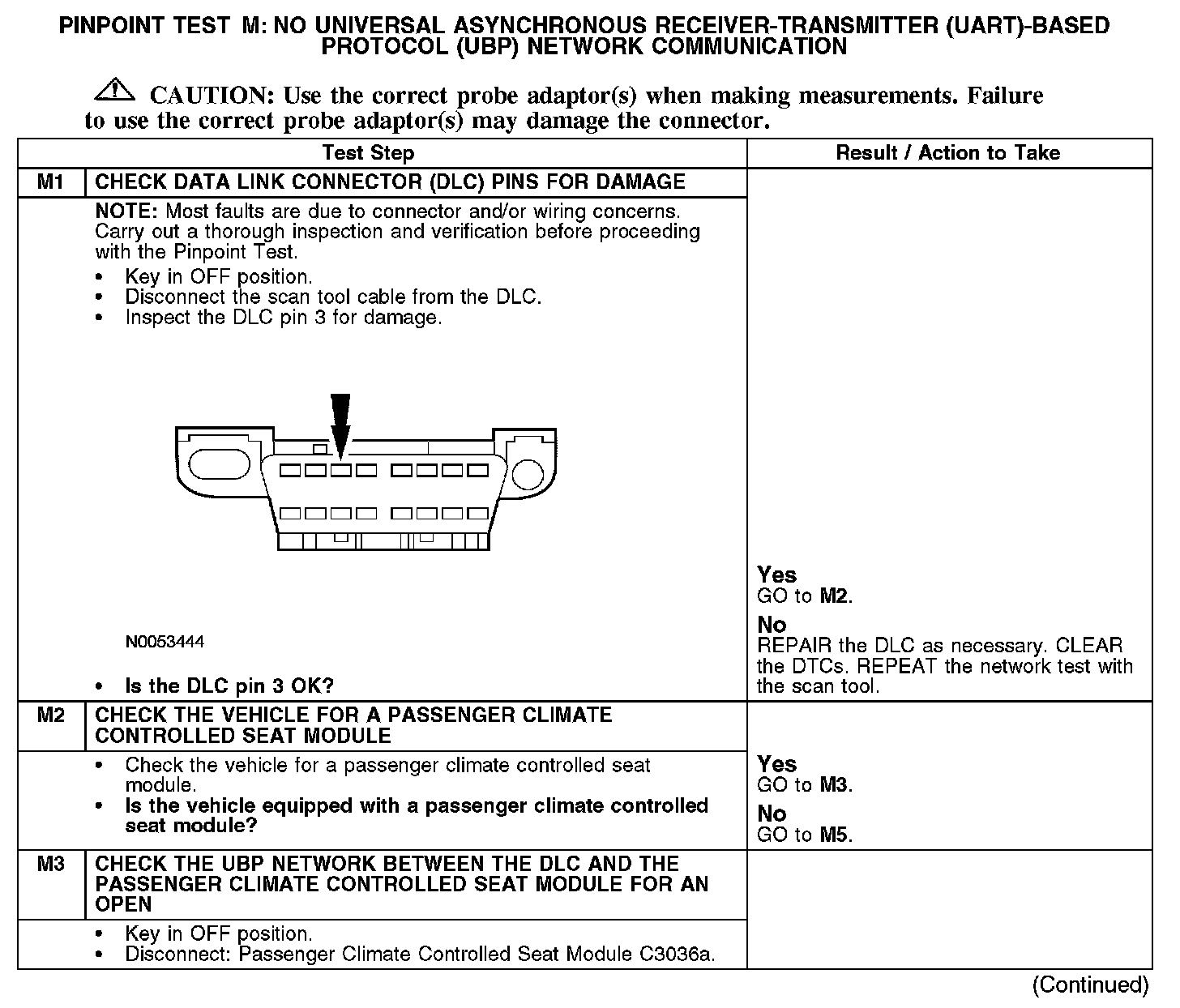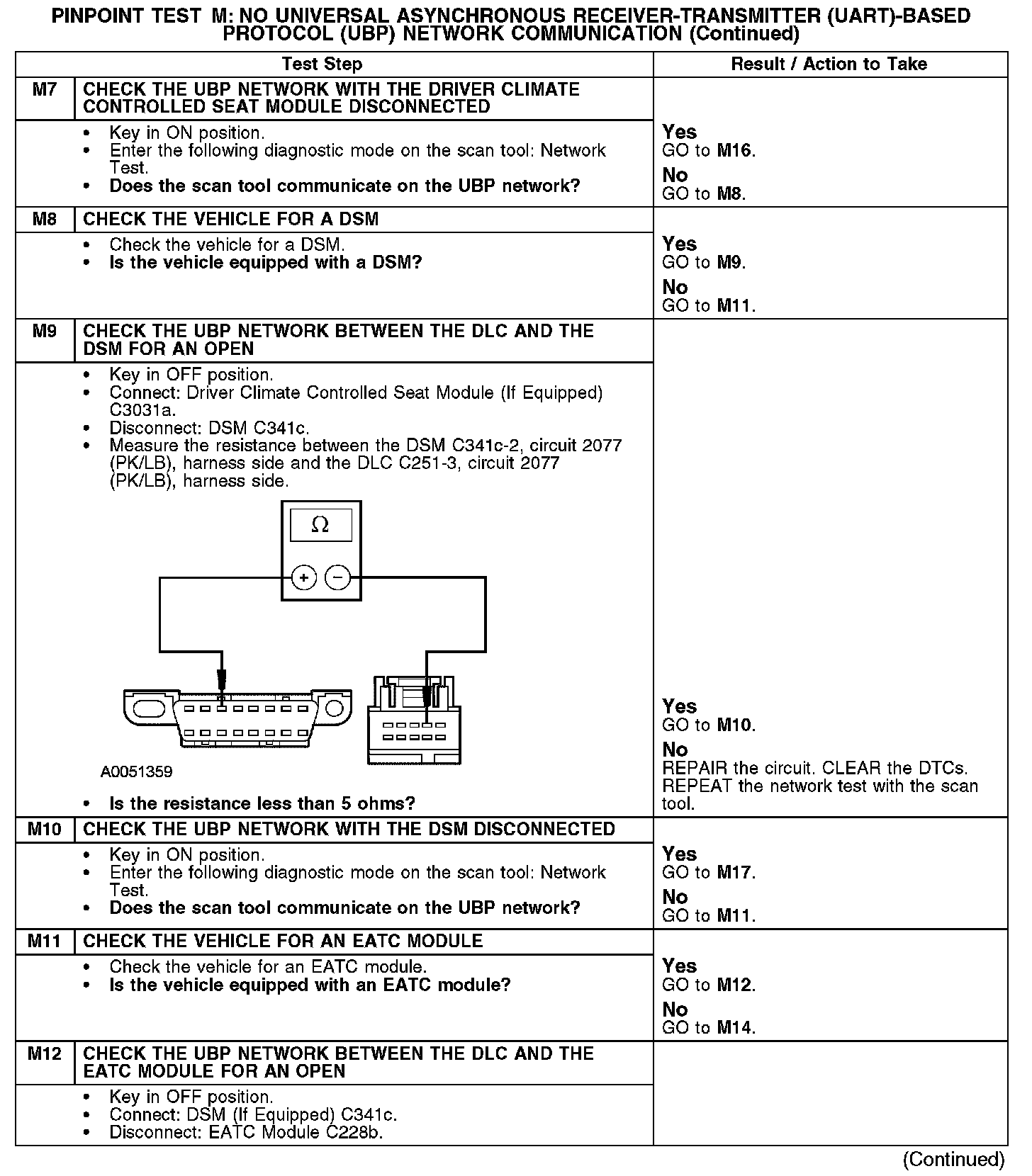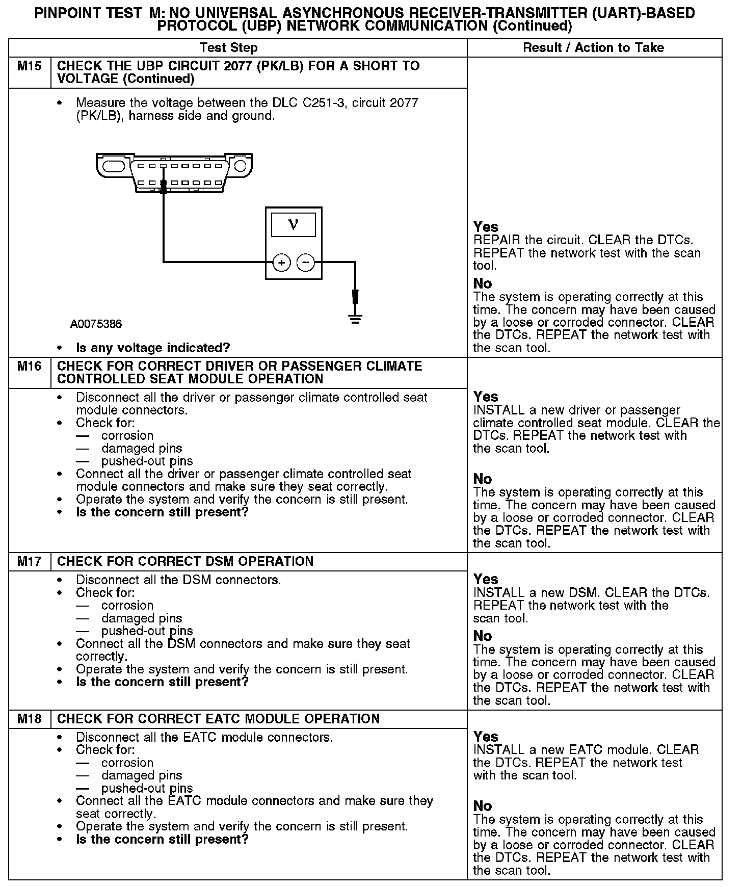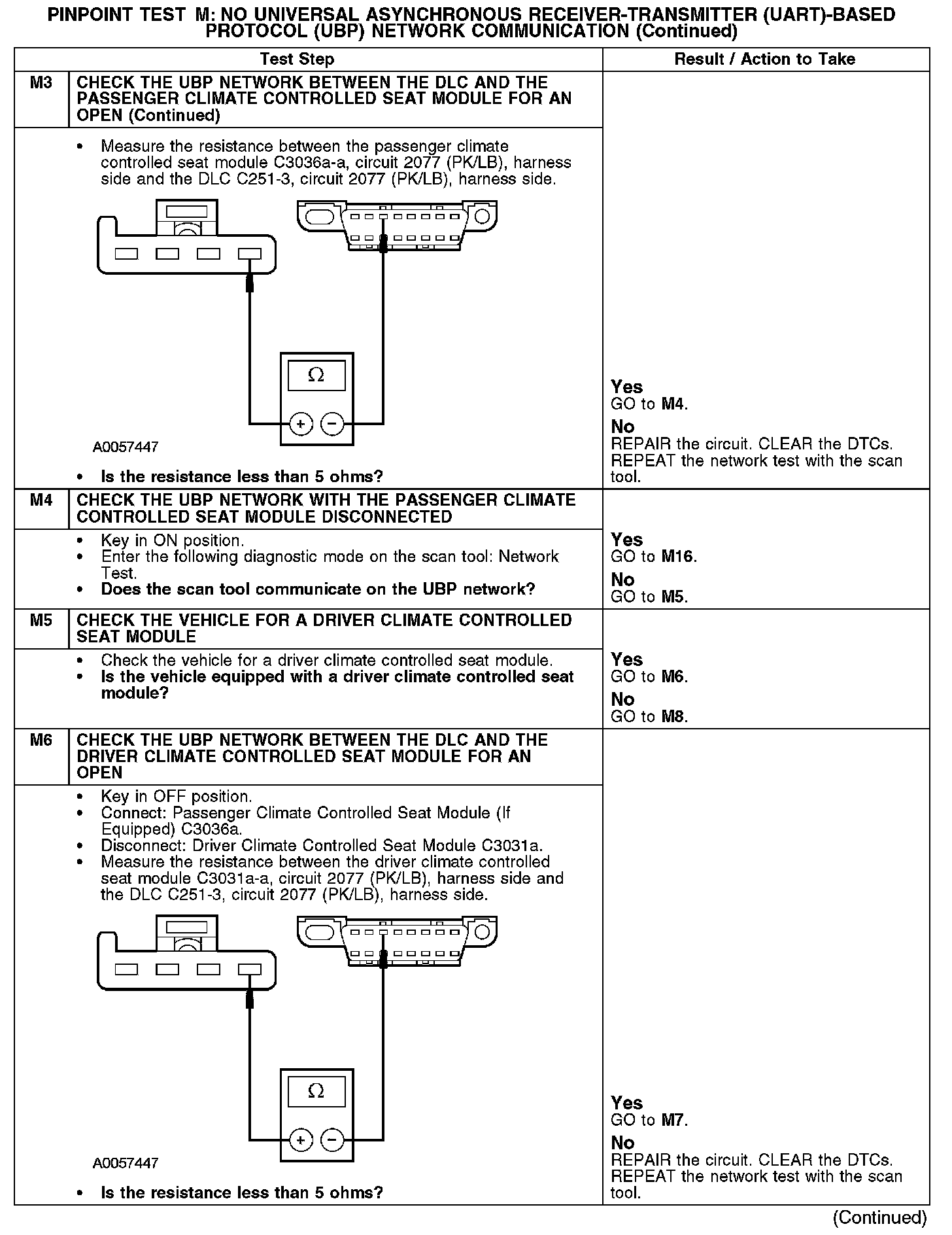 The driver climate control seat module, the passenger climate control seat module, the electronic automatic temperature control (EATC) module, and the driver seat module (DSM) communicate with the diagnostic tool through the UBP communications network, circuit 2077 (PK/LB).