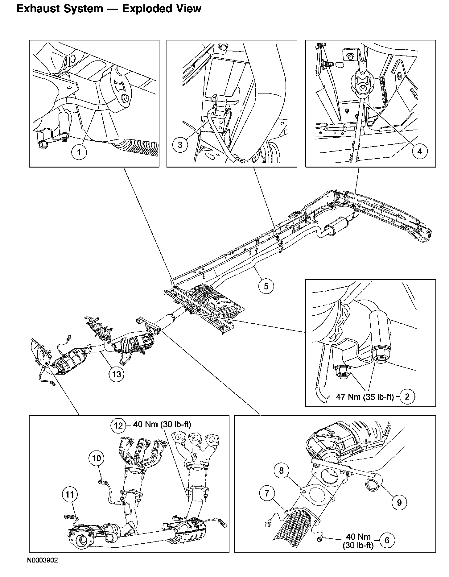 NOTE: Exhaust fasteners are of a torque prevailing design. Use only new fasteners with the same part number as the original. Torque values must be used as specified during reassembly to make sure of correct retention of exhaust components.