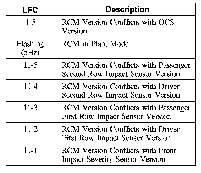 If the RCM receives conflicting information from the impact sensors or OCS system it will store diagnostic trouble code (DTC) C1414 in memory and, depending on the fault, flash a lamp fault code (LFC) on the air bag indicator.