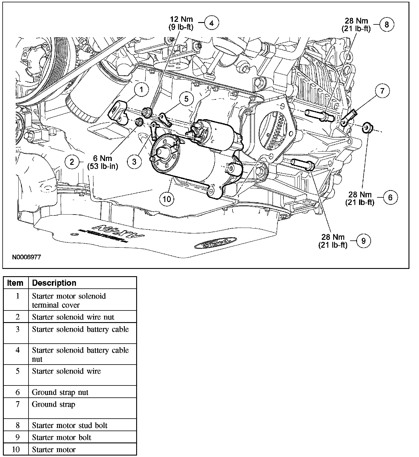 - When installing the starter motor bolts, first install the bolts hand tight, then tighten the upper stud bolt to 28 Nm (21 lb-ft), followed by the lower bolt to 28 Nm (21 lb-ft).