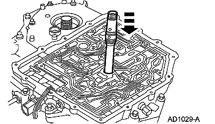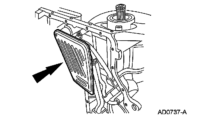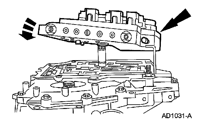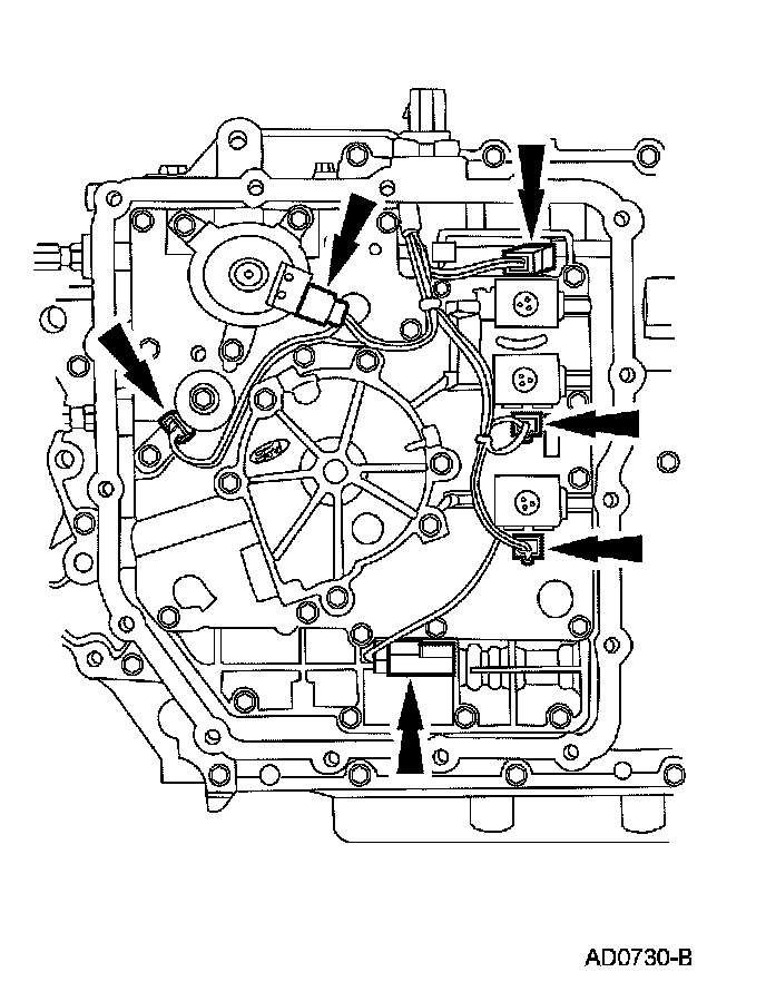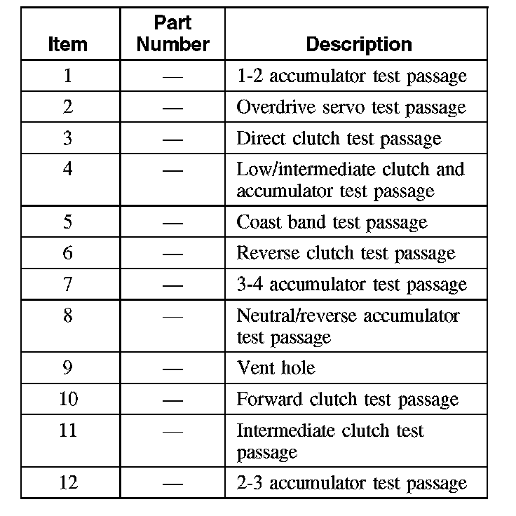 NOTE: When applying regulated 276 kPa (40 psi) air pressure to the appropriate passage, a dull thud should be heard when the clutch or band applies. There should be no hissing sound when the clutch or band applies.