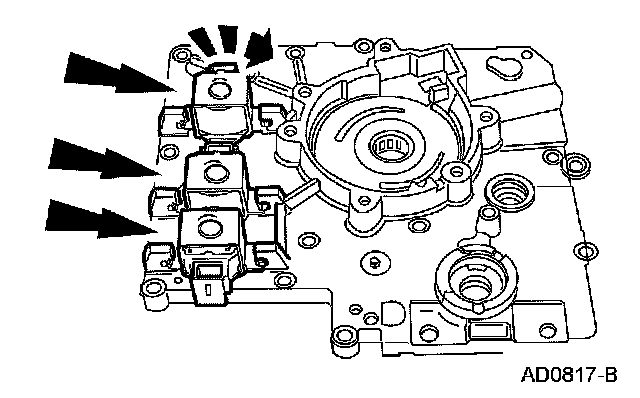 Install new O-ring seals and install the shift solenoids by pressing down and rotating them until they lock in place.