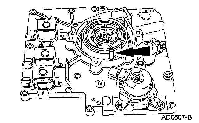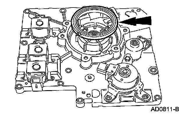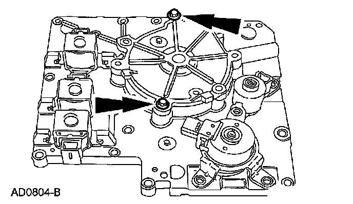 Remove the shift solenoids by pressing locking tab with a screwdriver and rotating them.