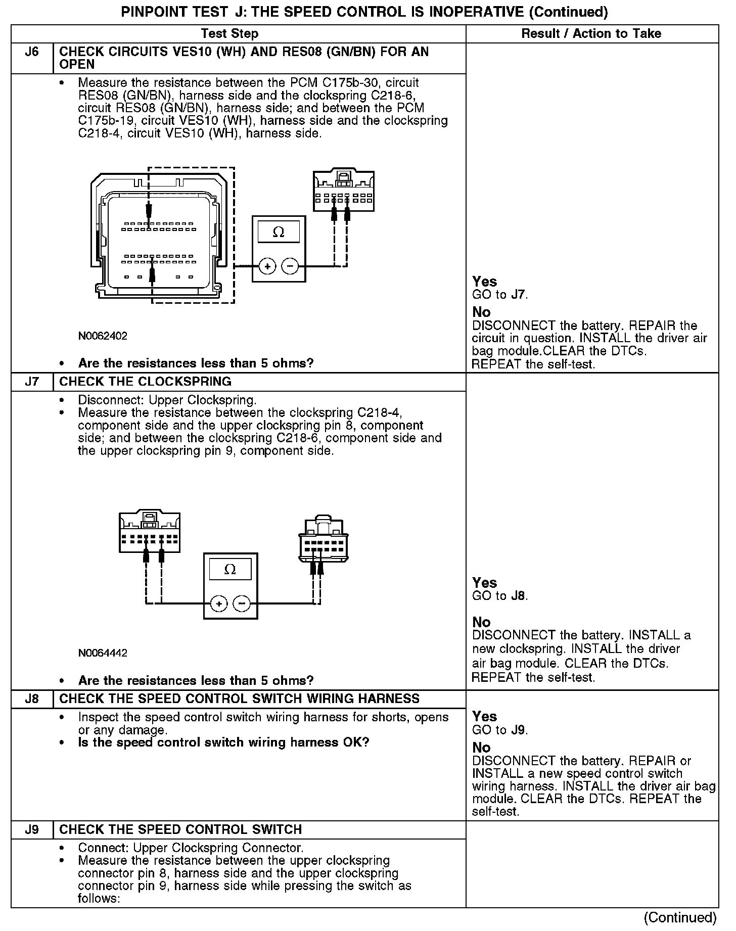 The PCM sends a signal through circuit VES10 (WH) to the speed control switches, which passes through the clockspring. The return signal is sent through circuit RES08 (GN/BN) and the clockspring.