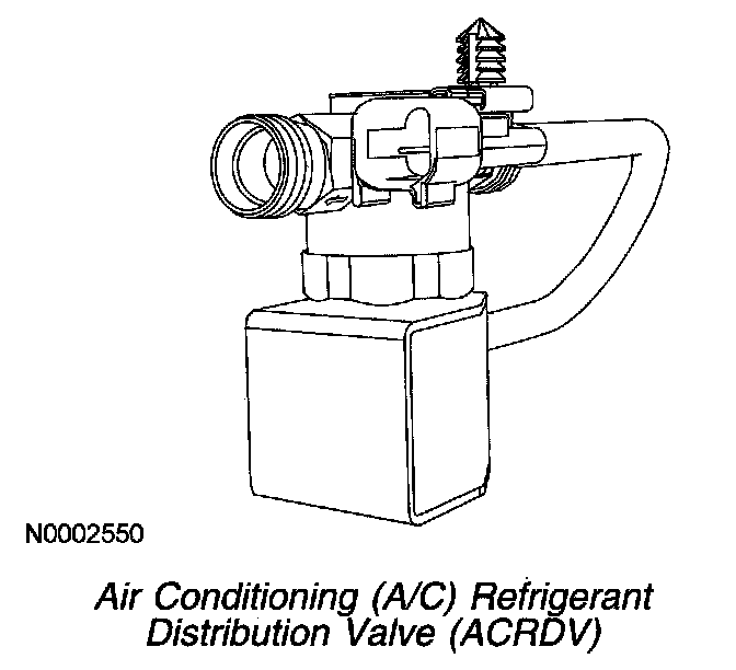 The ACRDV is a PCM controlled solenoid that provides a regulated control of refrigerant flow to the passenger compartment loop. The PCM opens or closes the ACRDV based on the passenger compartment A/C request. The ACRDV is a normally closed valve, preventing the refrigerant flow. When the passenger compartment A/C is requested ON, the PCM provides a ground path to the solenoid which opens the ACRDV.