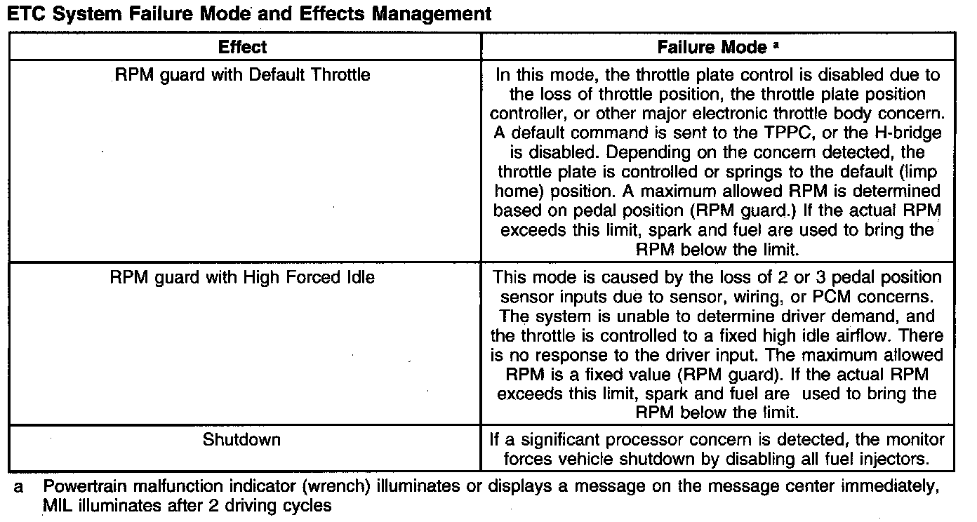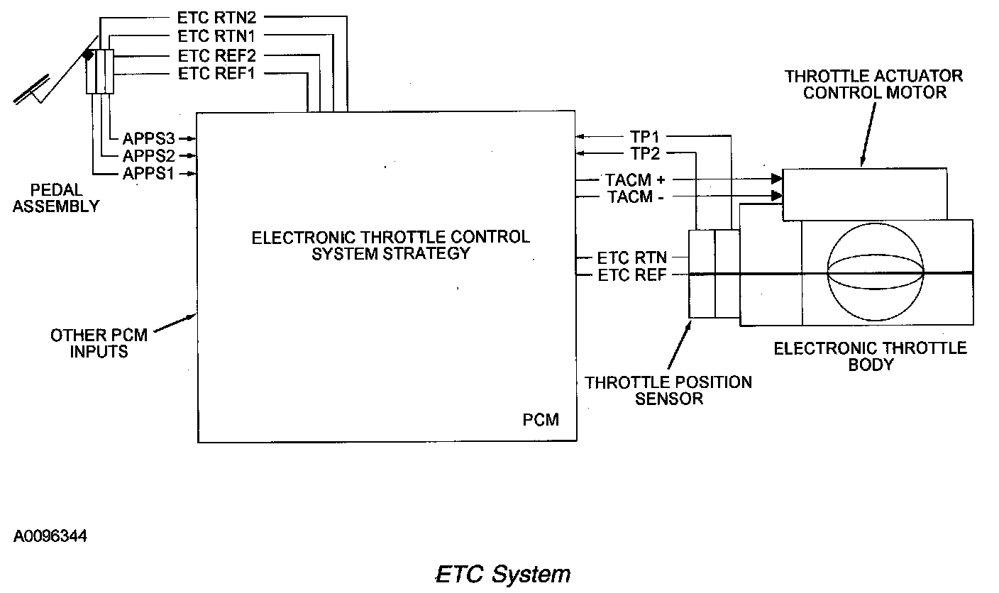 The torque based ETC is a hardware and software strategy that delivers an engine output torque (through throttle angle) based on driver demand (pedal position). It uses an electronic throttle body, the powertrain control module (PCM), and an accelerator pedal assembly to the control throttle opening and engine torque. The ETC system replaces the standard cable operated accelerator pedal, idle air control (IAC) valve, 3-wire throttle position (TP) sensor, and mechanical throttle body.