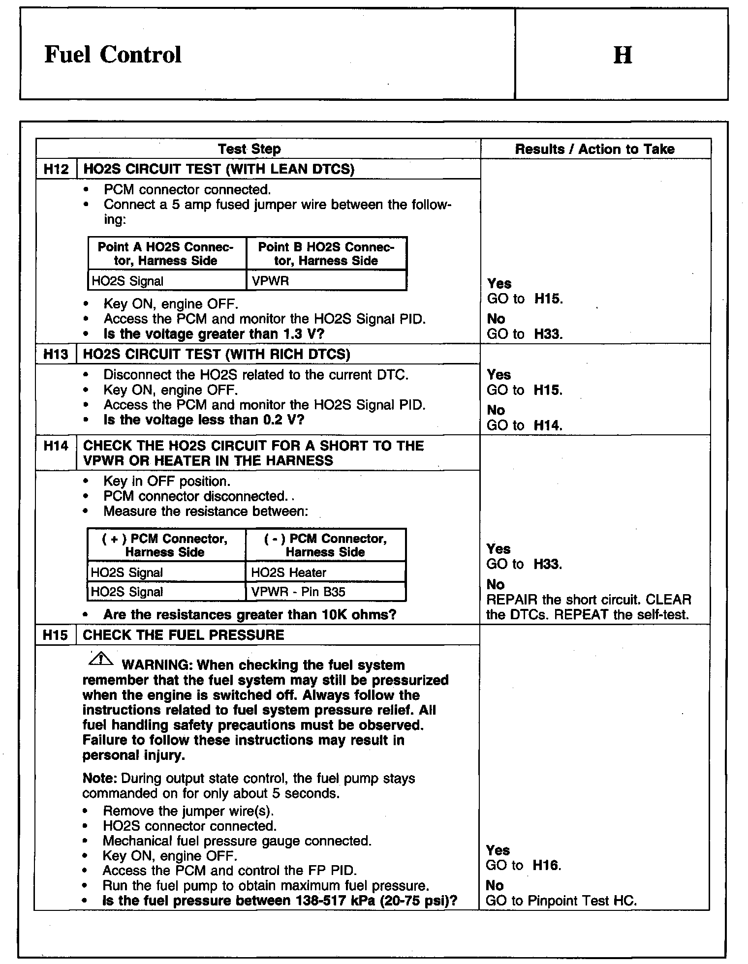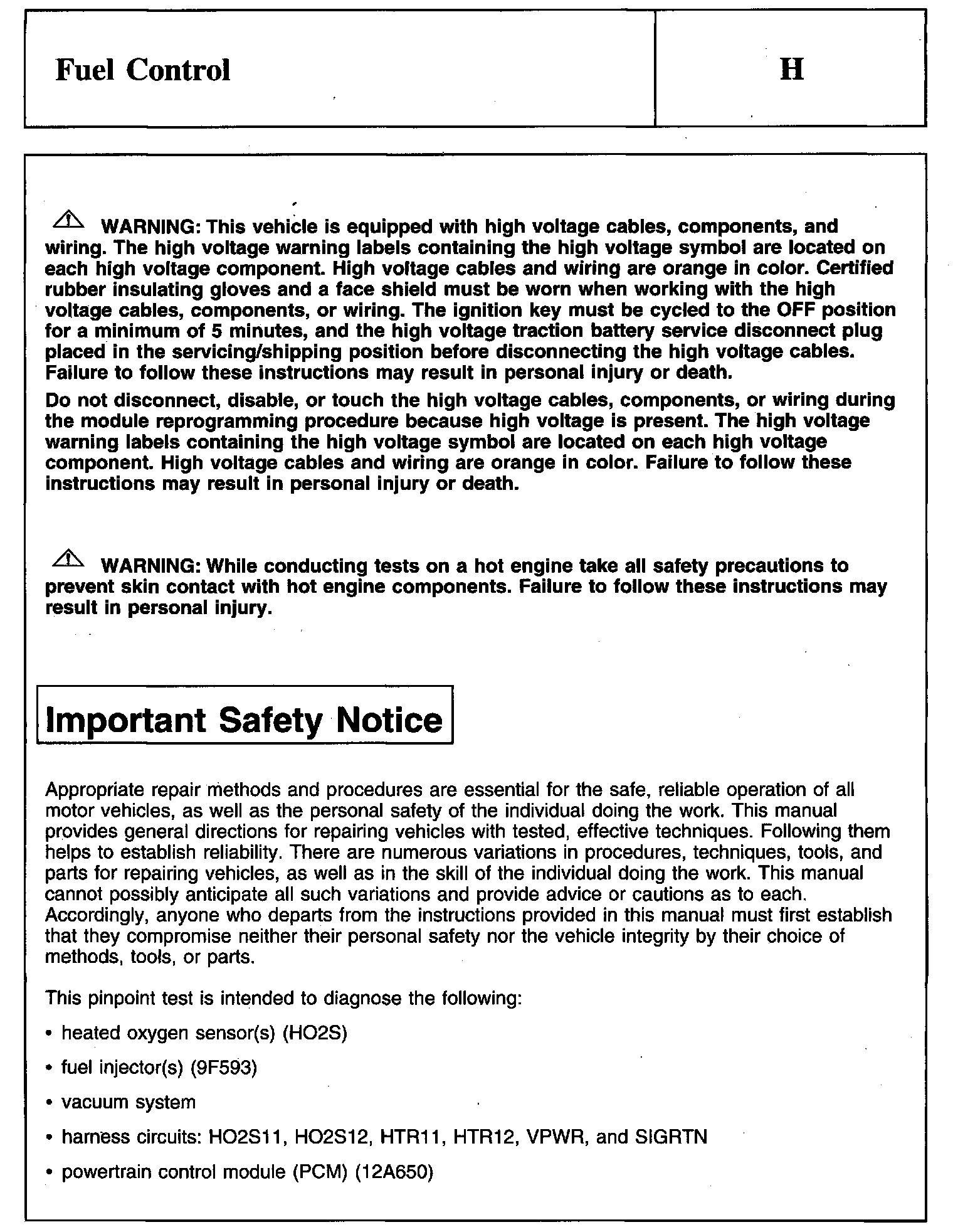 PINPOINT TEST H: FUEL CONTROLWarnings And Important Safety Notice: