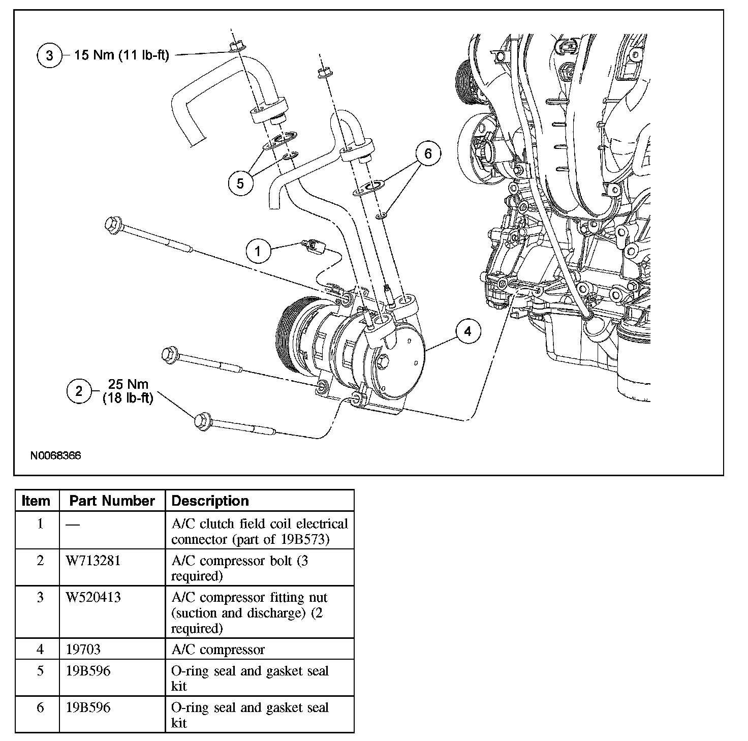 - To install, tighten the A/C compressor bolts to 25 Nm (18 lb-ft).