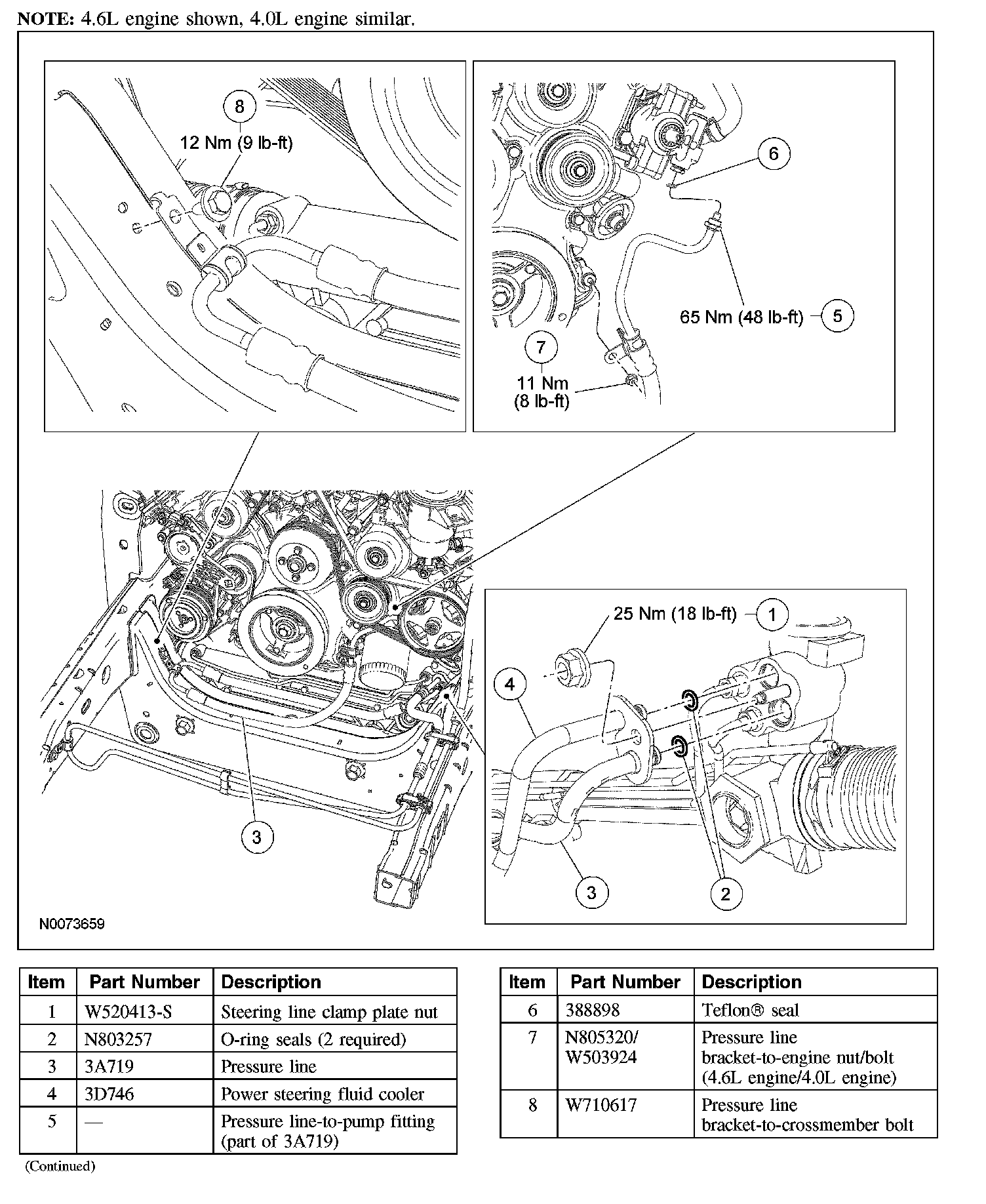 3. Install the pressure line bracket-to-engine nut (4.6L) or bolt (4.0L).