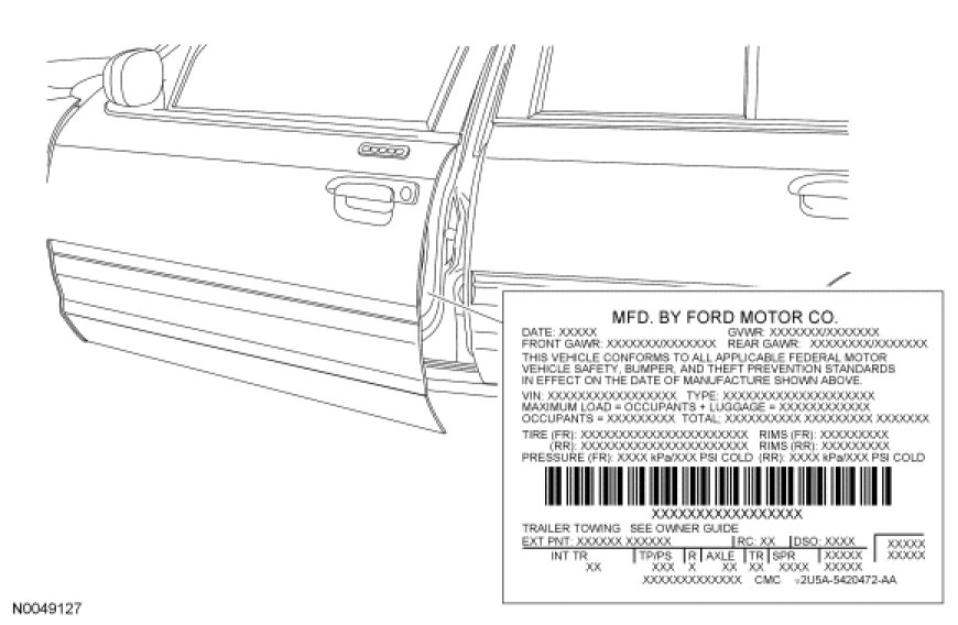 The upper portion of the Vehicle Certification (VC) label contains the manufacturer name, the month and year of manufacture, the certification statement and the Vehicle Identification Number (VIN). It also includes Gross Vehicle Weight Rating (GVWR) as well as tire size and pressure ratings. The VC label is located on the LH front door edge.