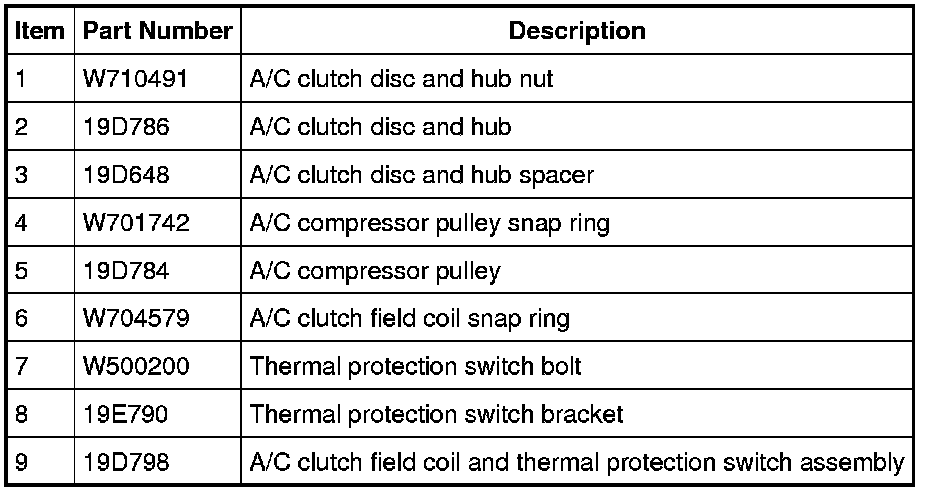 1. Visually inspect the A/C clutch disc and hub, A/C compressor pulley and A/C clutch field coil for damage.