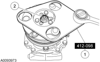 1. Using the Compressor Clutch Holding Tool, hold the A/C clutch disc and hub.