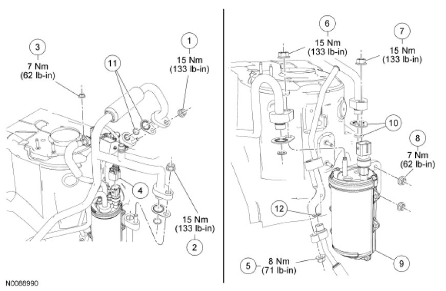 7. Remove the receiver/drier inlet and outlet fitting nuts and disconnect the outlet fitting.
