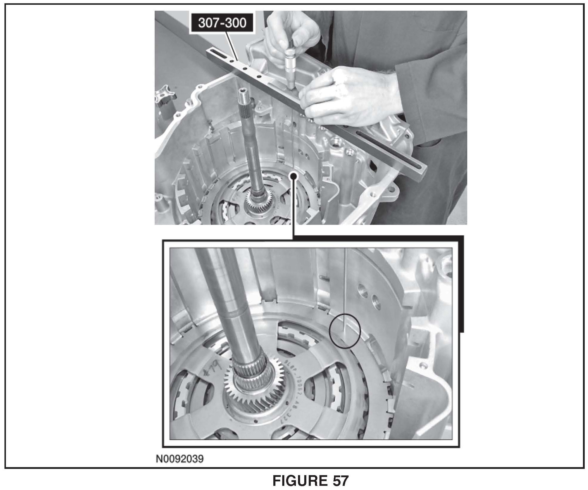 10. Using a suitable depth gauge, measure the distance from the Shim Selection Gauge # 307-300 to the top of the intermediate (2, 6) clutch pack at 3 different points and average the 3 distances Record this as measurement A. See Figure 57.