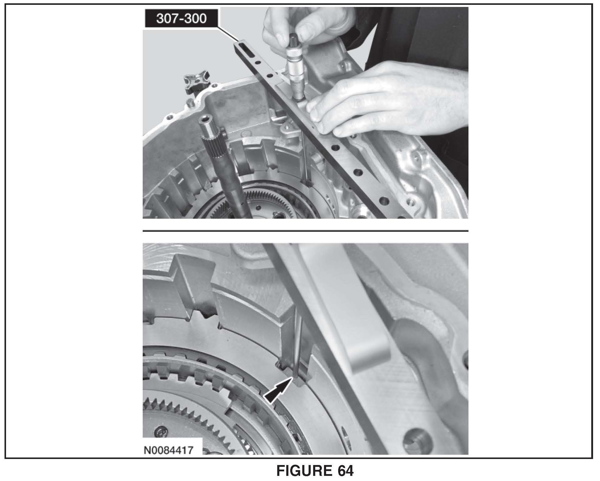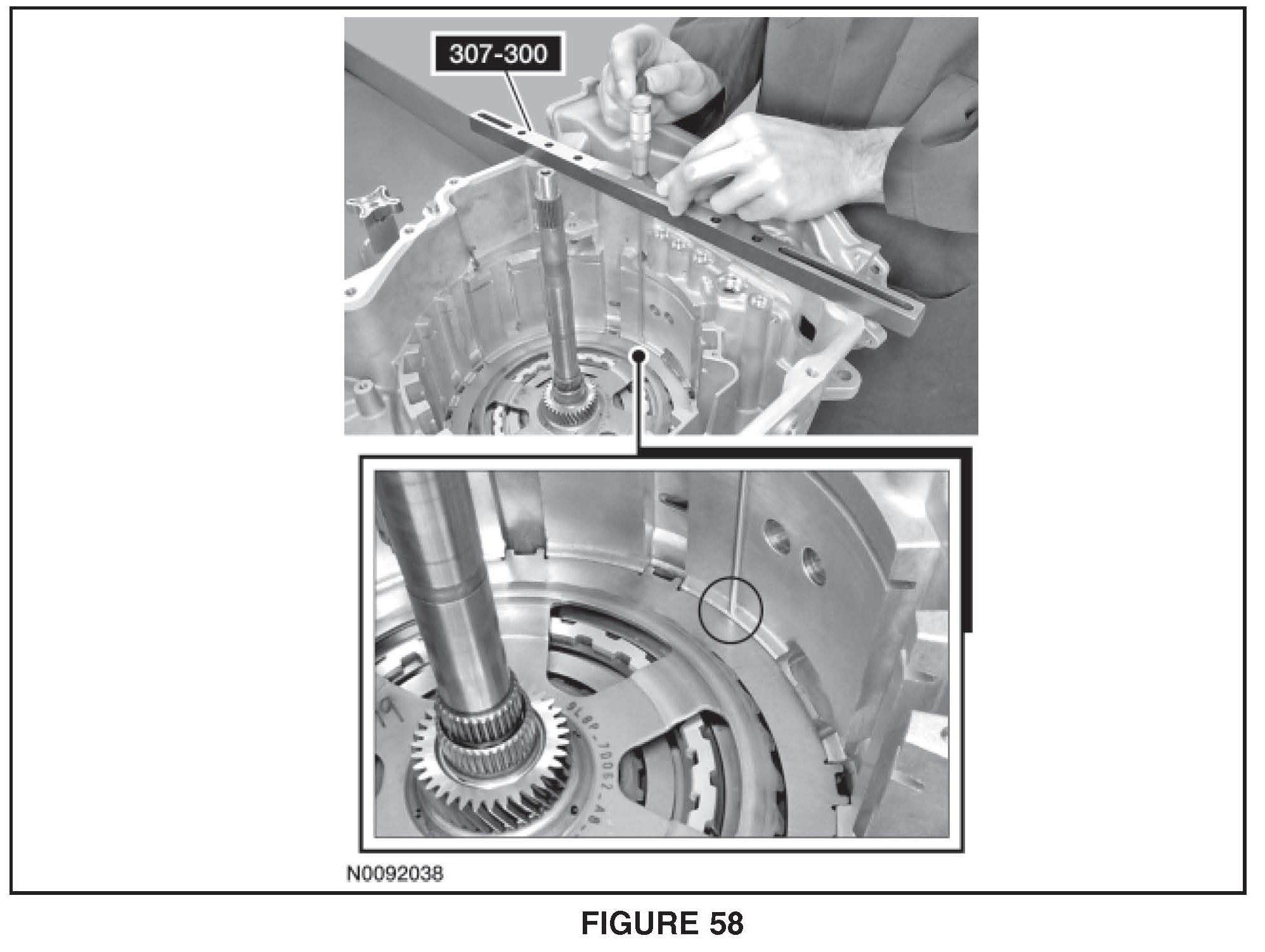 11. Using a suitable depth gauge, measure the distance from the top of Shim Selection Gauge # 307-300 to the transaxle case step above the intermediate (2, 6) clutch Record this as measurement B. See Figure 58.