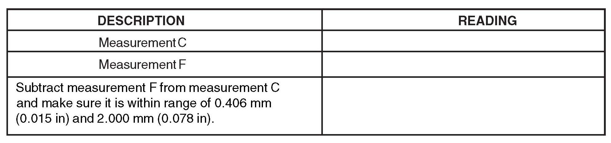 27. Subtract measurement F from measurement C to get the low/reverse clutch clearance. The clearance should be between 0.406 mm (0.015 in) and 2.000 mm (0.078 in). If the clearance is out of range, check the low/reverse clutch pack for correct installation. If the low/reverse clutch pack is still out of range, call the SSSC for authorization to replace the low/reverse clutch pack.