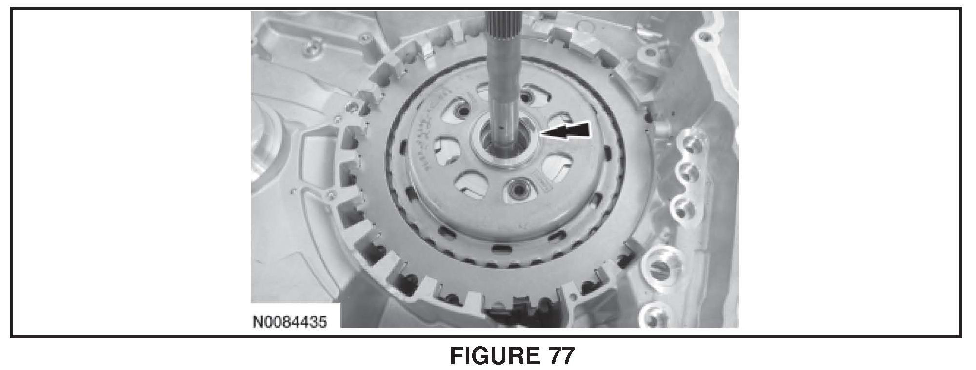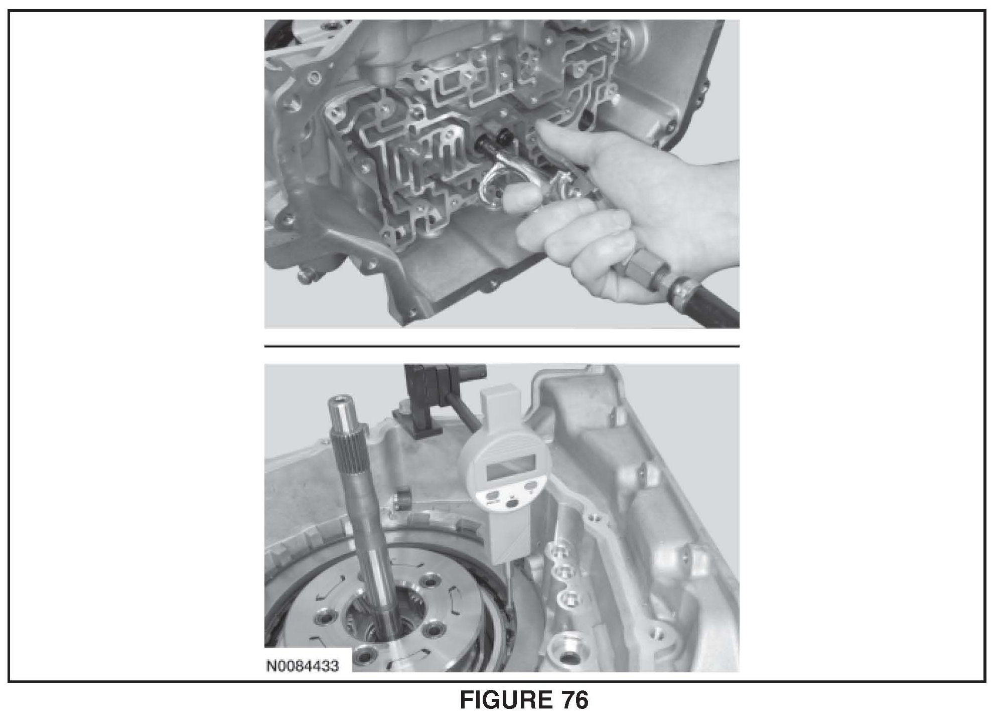 43. Apply 483 kPa (70 psi) of air pressure to the forward (1, 2, 3, 4) clutch piston port while recording the clutch pack clearance on the dial indicator. The clearance should be between 0.076 mm (0.002 in) and 1.840 mm (0.072 in). If the clearance is out of range, check the forward (1, 2, 3, 4) clutch pack for correct installation and the transaxle for correct assembly. See Figure 76.