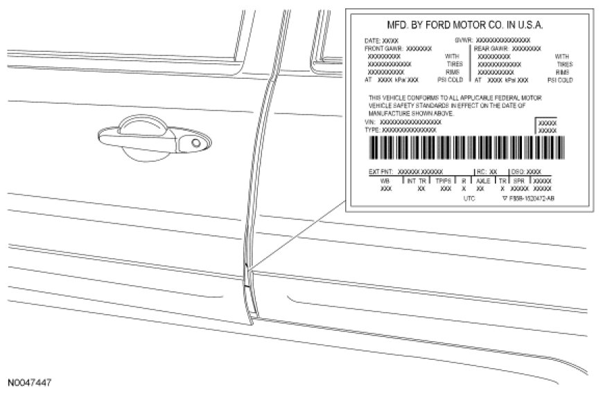 The upper portion of the Vehicle Certification (VC) label contains the manufacturer's name, the month and year of manufacture, the certification statement and the VIN. It also includes Gross Vehicle Weight Rating (GVWR). The VC label is located on the left-hand door jamb. The serial number can also be found on the engine block, transmission and frame.