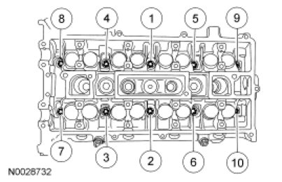 Install the cylinder head and 10 new bolts. Tighten the bolts in the sequence shown in the following 5 stages:Stage 1: Tighten to 5 Nm (44 lb-in).