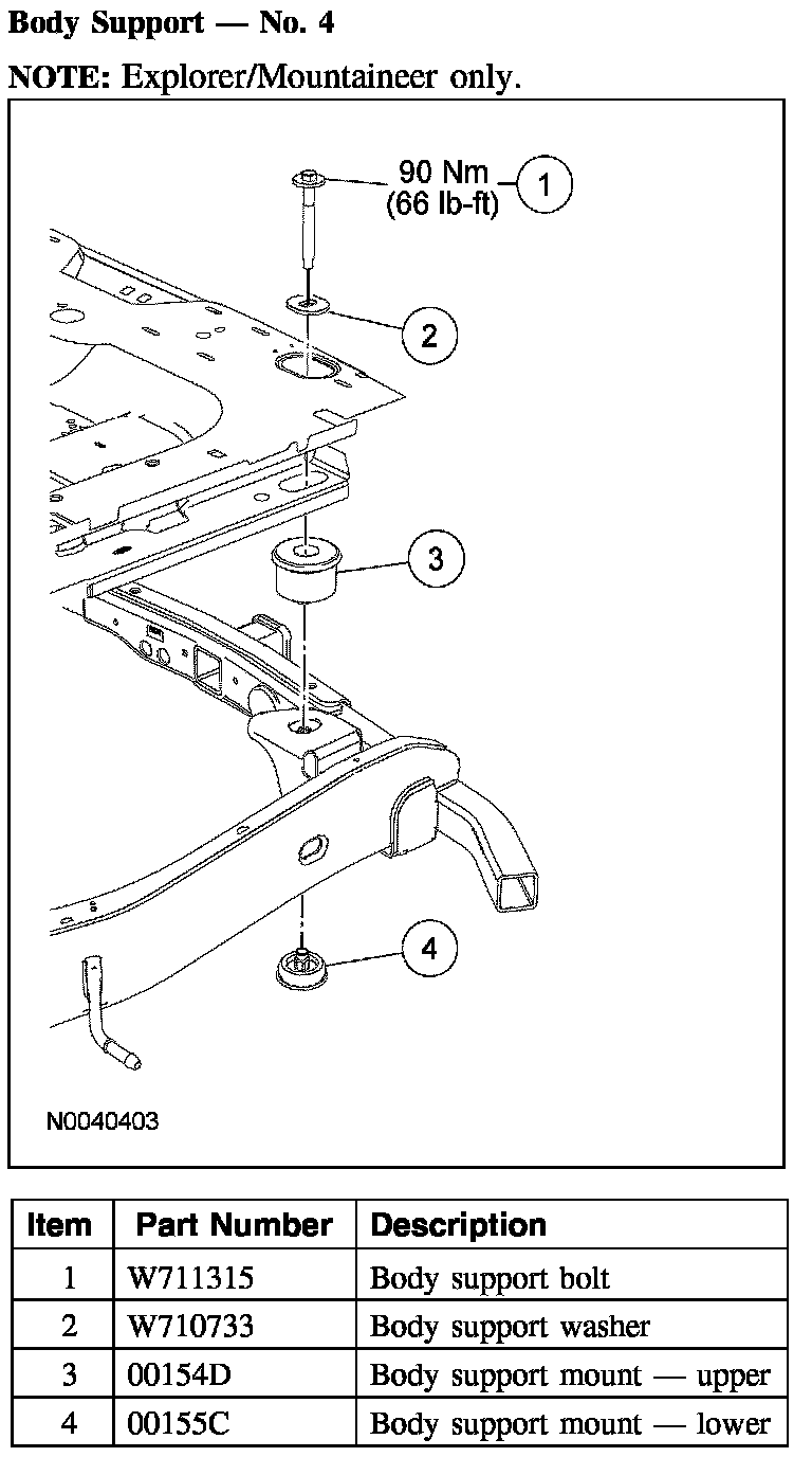 The frame consists of 2 steel-channel rails, 10 crossmembers for Explorer Sport Trac or 8 crossmembers for Explorer/Mountaineer including a front crossmember, transmission support crossmember and a rear crossmember (trailer hitch). New side rails and welded crossmembers, including the trailer hitch, are not installed separately. A front frame rail repair kit is available if the front rail is to be repaired and a rear crossmember (hitch) repair kit is available if the rear crossmember or rail is to be repaired.