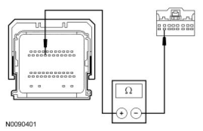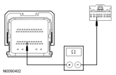 - Measure the resistance between the PCM C175b-30, circuit RES08 (GN/BN), harness side and the clockspring C218a-14, circuit RES08 (GN/BN), harness side.