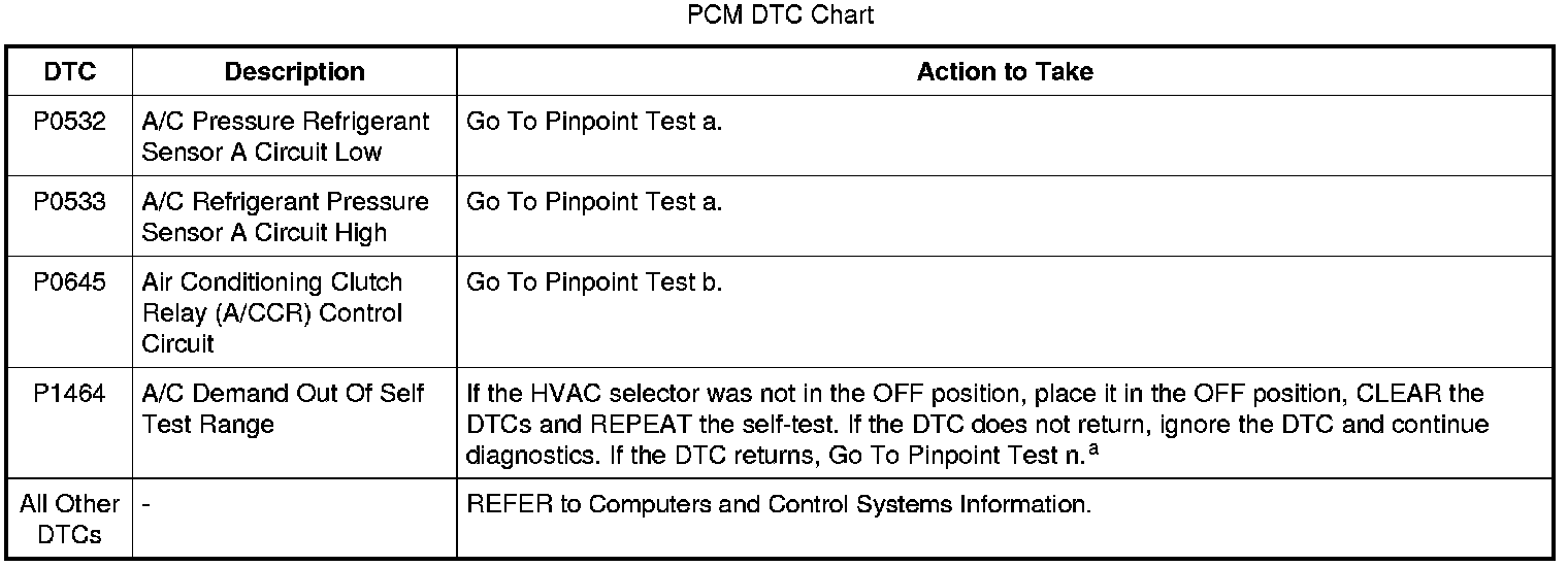 PCM DTC P1464 will set if the function selector is in PANEL with A/C button pressed, DEFROST or MAX A/C mode when the on-demand self test is being run.
