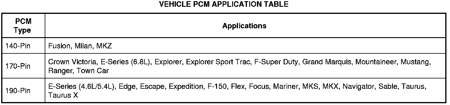 The center of the electronic engine control (EEC) system is a microprocessor called the PCM. The PCM receives input from sensors and other electronic components (switches, relays). Based on the information received and programmed into its memory, the PCM generates output signals to control various relays, solenoids and actuators. There are several different types of PCMs in use for this model year. Refer to the Vehicle PCM Application Table below for PCM types and their applications.